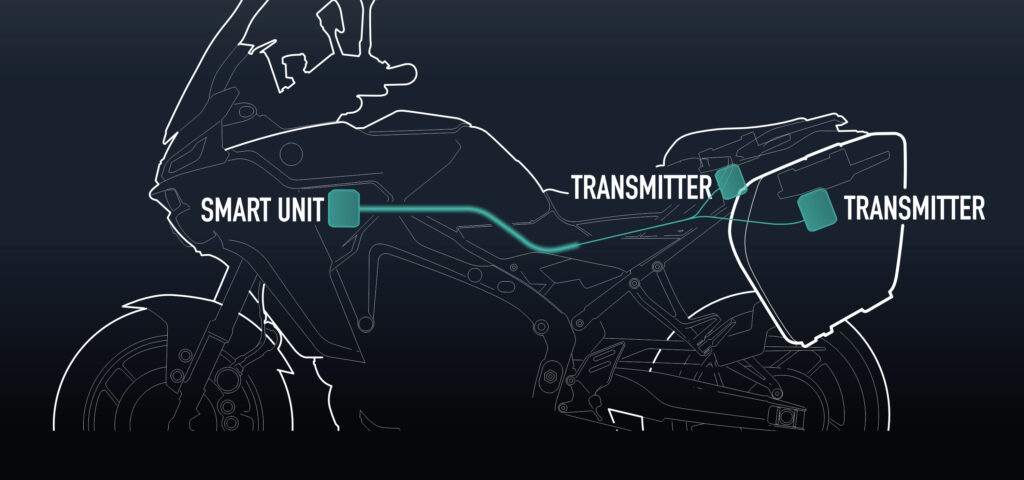 Esta transferencia de energía permite abrir y cerrar la maleta, a la vez que disponer de luz de cortesía o puerto de carga USB. Además, en caso de que la moto comience a circular sin que se hayan cerrado las maletas, la centralita enviará una señal para que se cierren automáticamente cuando la moto supere los 10 km/h.